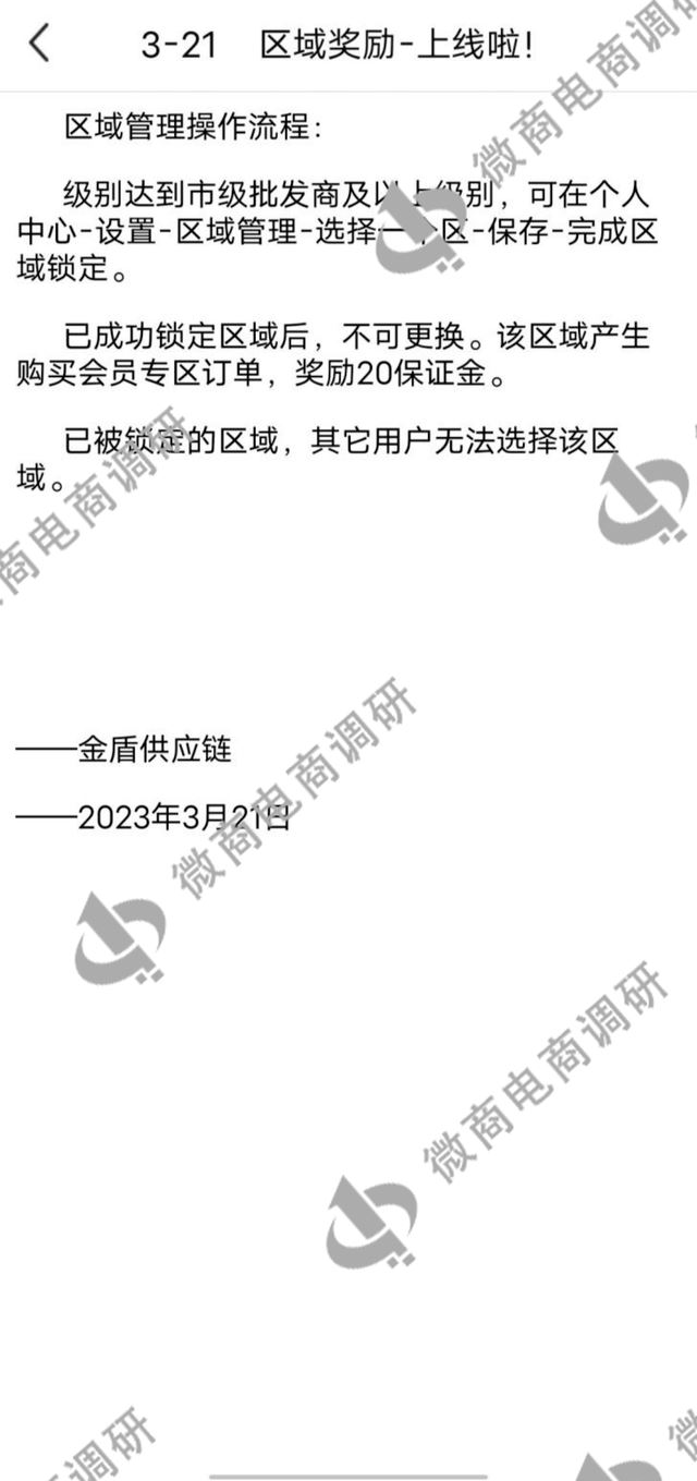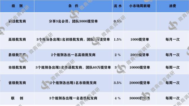 为了鼓励用户分享好友,金盾供应链还设置了六个管理等级,初级批发商、高级批发商、县级批发商、市级批发商、省级批发商和联创。 分享3名会员(购买99元水果)且团队摘牌获得提货单达到3000可成为初级批发商,初级批发商可获得团队摘牌流水0.5%的仓单奖励;团队中拥有3名初级批发商,且团队摘牌获得提货单达到20000可成为高级批发商,高级批发商可获得团队摘牌流水1.5%的仓单奖励,高级批发商必须每月进行一次消费并且小市场需每周新增1000提货单;团队中拥有2名高级批发商可成为县级批发商,县级批发商可获得团队摘牌流水2%的仓单奖励,县级批发商必须每月进行一次消费并且小市场需每周新增2000提货单;团队中拥有3名县级批发商,且团队摘牌获得提货单达到60万可成为市级批发商,市级批发商可获得团队摘牌流水3%的仓单奖励,市级批发商必须每周进行一次消费并且小市场需每周新增10000提货单;团队中拥有2名市级批发商可成为省级批发商,省级批发商可获得团队摘牌流水3.5%的仓单奖励,省级批发商必须每周进行一次消费并且小市场需每周新增20000提货单;团队中拥有3名省级批发商可成为,联创可获得团队摘牌流水4%的仓单奖励,联创必须每周进行一次消费并且小市场需每周新增30000提货单。 金盾供应链还设置了平级奖励,只要团队中有人和自己达到同级,就可以获得其所有收益10%的平级奖励,并且没有层级限制,只要是自己团队的都计算在内。