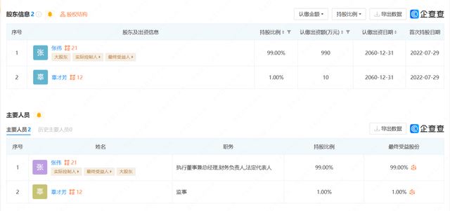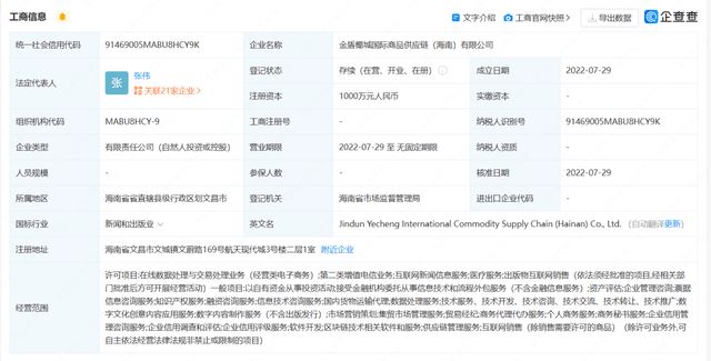 企查查APP显示,金盾椰城国际商品供应链(海南)有限公司成立于2022年7月29日,成立至今不足一年,企业地址位于海南省文昌市文城镇文蔚路169号航天现代城3号楼二层1室,注册资本为1000万元,实缴资本为0,法定代表人为张伟。该公司由张伟控股99%并担任执行董事兼总经理,辜才芳持股1%并担任监事,张伟是该公司的实际控制人和最终受益人。
