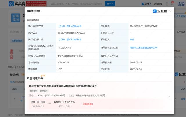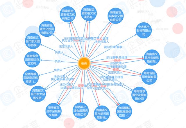 企查查显示,张伟共与21个企业有关联。他除了是金盾椰城国际商品供应链(海南)有限公司的董事长。还对外投资了海南省文昌市航天国际影视中心、海南省金盾影视文化演艺有限公司、海南省文昌市金航购物有限公司等11个企业,其中有两个企业已被注销,担任了海南悦享置业发展有限公司、海南省金盾影视文化演艺有限公司陕西分公司、海南省金盾文化投资有限公司等10个企业的高管。但张伟在其中一个公司的股份曾被法院执行冻结。