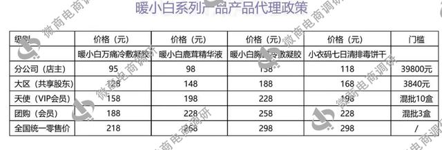 此前,国家药品监督管理局曾发布公告,称不存在所谓的械字号面膜概念。该公告指出,械字号面膜就是医用敷料,属于医疗器械范畴。国家药监局还曾提示,相关产品应在其适用范围或预期用途允许的范围内,由有资质的医生指导并按照正确的用法用量使用,不能作为日常护肤产品长期使用。 六大职级,推荐奖励 接下来,我们再来关注一下暖凶推行的奖金制度该如何解读。据推广人员阿强(化名)提供的资料显示,暖凶将参与者主要分为了会员(团购)、天使(VIP会员)、大区(共享股东)、分公司(店主)共计四个级别,不同级别对应的拿货价不同,我们以零售价为218元的暖凶万痛冷敷凝胶为例,会员(门槛为混批3盒)的拿货价为188元,天使(门槛为混批10盒)的拿货价为158元,大区(门槛为3840元)的拿货价为128元,分公司(门槛为39800元)的拿货价为95元。