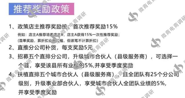 一、推荐奖励政策: 1.店主推荐奖:首次推荐奖励15%,例如店主A推荐店主B,店主A获得15%一次性推荐奖励(首单奖励算折扣业绩门槛,但该笔不计算折扣)。 2.直推分公司补货,每支产品奖励5元。 3.招募5个直排分公司,升级为城市合伙人(县级服务商),可选择一个县,享受该县区内所有业绩的5%,并享受季度奖励。 4.扶植直排5个城市合伙人,且团队内部发展出25个分公司,即升级为事业部合伙人,享受城市合伙人全团队业绩的5%。