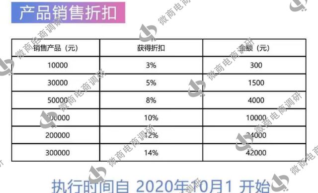 二、产品销售折扣 销售产品业绩达到1万元,获得折扣3% 销售产品业绩达到3万元,获得折扣5% 销售产品业绩达到5万元,获得折扣8% 销售产品业绩达到10万元,获得折扣10% 销售产品业绩达到20万元,获得折扣12% 销售产品业绩达到30万元,获得折扣14%