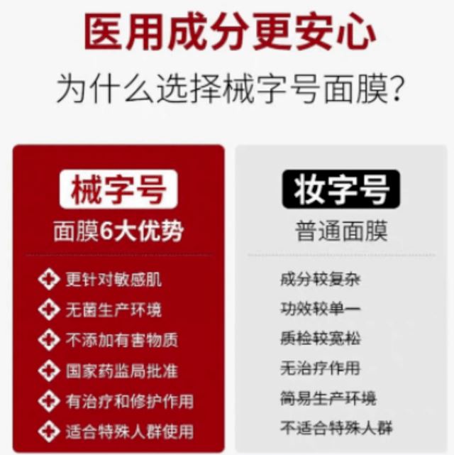 而根据有关规定,不论是妆字号产品还是械字号产品,都不能以械字号面膜、医用面膜、医美面膜等广告语进行自我标榜。按照医疗器械管理的医用敷料命名应当符合医疗器械通用名称命名规则要求,不得含有美容保健等宣称词语,不得含有夸大适用范围或者其他具有误导性、欺骗性的内容。因此,不存在械字号面膜的概念,医疗器械产品也不能以面膜作为其名称。