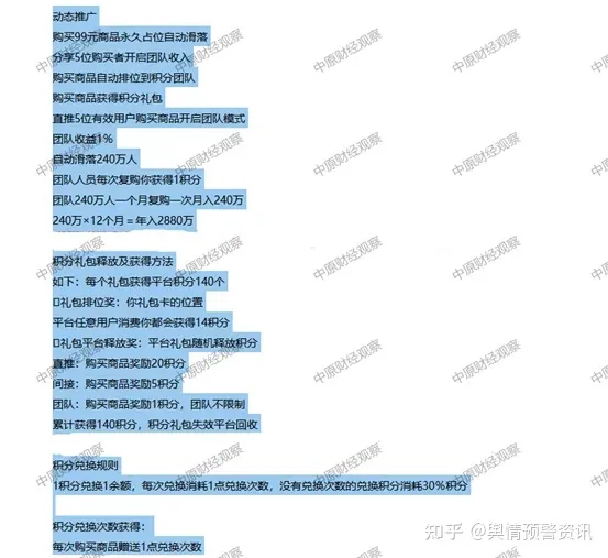 璀璨优购商城以购买一定商品获取积分作为获利条件;以高额收益回报诱惑加入者发展下线并使其进行购买商品获得利益,从而形成上下线关系;以团队的消费业绩为依据计算报酬。这种入门费、拉人头、团队计酬模式已经涉嫌违法违规。 以打造一款让老百姓既省钱又赚钱的平台为目标的璀璨优购商城今后如何发展?中原财经观察将持续保持关注。 |