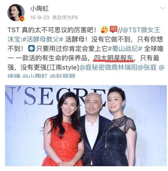 值得关注的是,TST宣传徐峥陶虹夫妇都是其公司的联合股东,徐峥陶虹夫妇也多次为其站台。张庭的好闺蜜陶虹更是通过工商登记成为其股东(直接持股1.9301%,通过独资公司北京最陶然服装服饰有限公司间接4.7049%),因为去其公司站台,被很多员工称为二老板。 据媒体报道,有传闻称陶虹从达尔威公司5年分了4.2亿,比拍戏挣得还多,不过该信息并未得到证实。