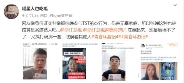 2023年4月8日晚,浙江卫视综艺节目青春环游记4开播,而首波参演的中国著名导演、演员徐峥在栏目官宣后遭到多名网友实名抵制参演,原因是徐峥与TST品牌的涉传有关,伤害了无辜家庭,属于劣质艺人,呼吁抵制。