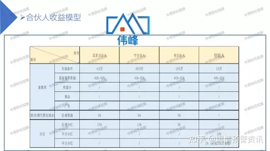 图片来源:该平台推广资料 四、合伙人收益:分为区县合伙人、市合伙人、省合伙人、创始人四个级别。 区县合伙人:向平台缴纳4.9万元代理费即可成为区县合伙人,可享受直推奖励的40%-60%,区域奖励的5%,以及15%的区域分红; 市合伙人:向平台缴纳39.9万元代理费即可成为市合伙人,可享受直推奖励的40%-60%,区域奖励的5%,以及10%的区域分红; 省合伙人:向平台缴纳199万元代理费即可成为省合伙人,可享受直推奖励的40%-60%,区域奖励的5%,以及5%的区域分红。 创始人:向平台缴纳10万元的代理费即可成为创始人,可享受直推奖励的40%-60%,平台分红的10%。