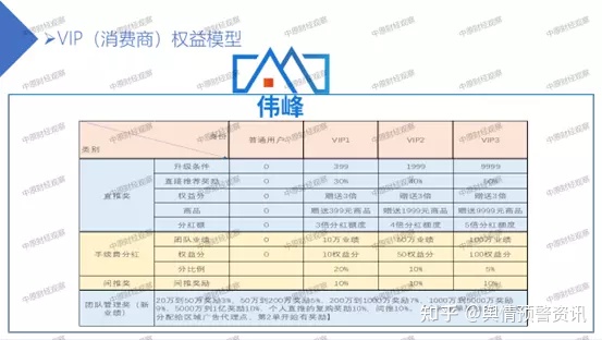 图片来源:该平台推广资料 VIP3:用户在平台消费9999元购买产品,且团队业绩达到100万,团队权益分达到100万分,即可升级为VIP3,在获得产品的同时,赠送四倍权益分,并获得分红额5倍的加持,直推奖励50%,5%的团队手续费分红以及10%的间推奖励。