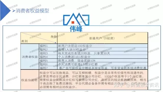 图片来源:该平台推广资料 我国广告法第二十五条对于投资理财类广告有明确约束:招商等有投资回报预期的商品或服务广告,应当对可能存在的风险以及风险责任承担有合理提示或者警示,并不得含有下列内容:一是对未来效果、收益或与其相关的情况作出保证性承诺,明示或者暗示保本、无风险或者保收益等。同时广告法第九条第(三)项的规定,广告不等使用国家级、最高级、最佳等用语。 消费者到消费商,如何解读? 接下来,我们再来关注一下伟峰电商推行的等级制度,以及对应的收益该如何解读。据推广人员阿兴(化名)提供的资料显示如下: 一、消费者权益介绍: 新用户注册即为消费者,平台赠送100权益分;每日完成任务可获得20权益分(期限30天);每直推一个新用户可获得50权益分;个人消费平台赠送1:1权益分(消费1元送1权益分);个人消费可获得分红额1.5倍的加持;看广告可获得权益分以及现金收益,可享受平台消费优惠。 权益分说明:权益分可以兑换商品,可以互相转增,权益分是具有价值性和流通性的,主要带动全民消费,分红值享受公司分红,1000个权益分等于1分红值。需要权益分兑换成分红值可获得公司分红,花出去的钱还能赚回来,相当于商品除了免费还赚钱;平台代理必备条件需有相应的权益分。公司IPO也必须须有相对应的权益分。