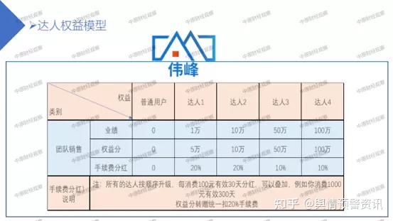 图片来源:该平台推广资料 二、达人权益介绍:分为达人1、达人2、达人3、达人4四个等级。 达人1:团队销售业绩达到1万元,权益分达到5万分,即可晋升为达人1,并享受20%的团队手续费分红; 达人2:团队销售业绩达到10万元,权益分达到10万分,即可晋升为达人2,并享受20%的团队手续费分红; 达人3:团队销售业绩达到50万元,权益分达到50万分,即可晋升为达人3,并享受10%的团队手续费分红; 达人4:团队销售业绩达到100万元,权益分达到100万分,即可晋升为达人4,并享受10%的团队手续费分红。 手续费分红说明:所有的达人按照顺序升级,每消费100元有效分红30天,可以无限叠加,例如用户消费1000元,有效期为300天,权益分转增统一扣除20%手续费。
