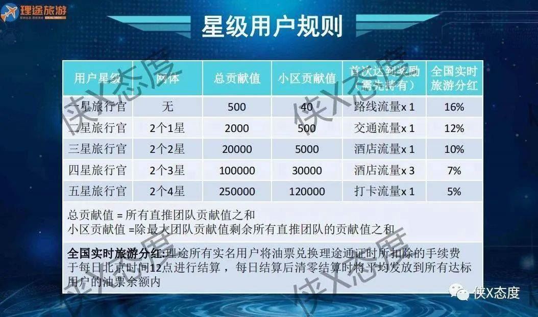 图片来源:该平台推广资料 同时该平台还设置了五级星级,参与用户可以通过达到不同的等级从而获得不同的分红收益,接下来为大家详细介绍: 一星旅行官.要求团队总贡献值达到500,除此之外剩余小区贡献值达到40。可以平分享受全国实时旅游分红16%; 二星旅行官.要求直推用户中有两个一星旅行官,团队中贡献值达到2000,除此之外剩余小区贡献值达到500.可享受平分全国实时旅游分红12%; 三星旅行官.要求直推用户中有两个二星旅行官,团队中贡献值达到20000,除此之外剩余小区贡献值达到5000.可享受平分全国实时旅游分红10%; 四星旅行官.要求直推用户中有两个三星旅行官,团队中贡献值达到100000,除此之外剩余小区贡献值达到30000.可享受平分全国实时旅游分红7%; 五星旅行官.要求直推用户中有两个四星旅行官,团队中贡献值达到250000,除此之外剩余小区贡献值达到120000.可享受平分全国实时旅游分红5%。