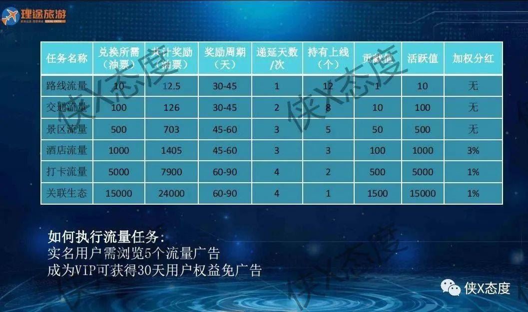 图片来源:企查查 五级代理,如何实现通证价值链? 据平台推广资料介绍,参与用户完成实名认证,均可免费获得一次价值10.00理途油票的流量任务,分30个自然日做任务领取油票。用户通过油票可以兑换六种流量任务包,最高可获得160%的油票奖励。再通过一定比例可以兑换为通证。