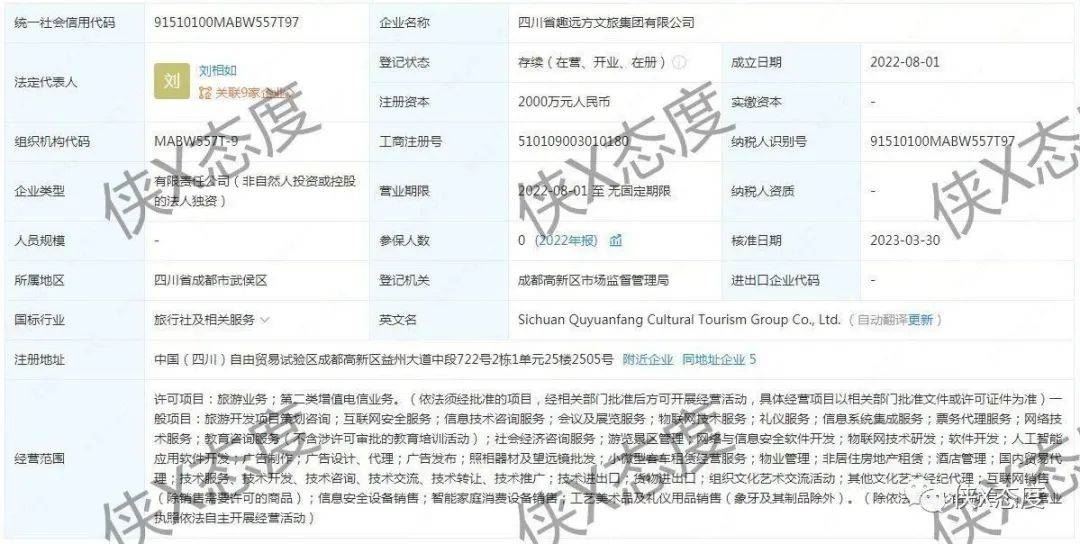 公司背景多方关联,现状如何? 据平台推广资料介绍理途旅游的主体经营公司为四川省趣远方文旅集团有限公司。经查,该公司成立于2022年8月1日,法定代表人为刘相如,注册资本2000万元,实缴0元,参保人数0人。