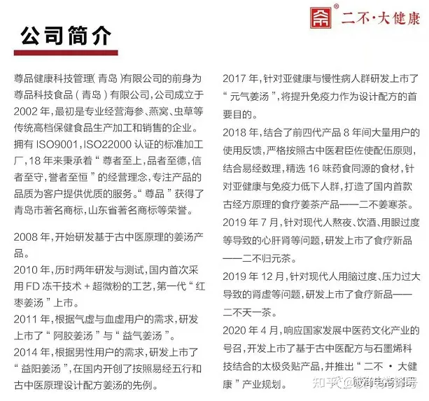 图片 普通食品,功效神奇? 了解完公司背景,下面再说说产品本身,据资料介绍,二不姜寒茶是尊品降科技管理(青岛)有限公司历时8年研发的姜枣汤系列第五代旗舰产品,并独立命名为姜寒茶,经过大量的市炒馈及不断改善于2018年7月7日走向市场。二不姜寒茶的产品名字取义为政篇第26章中的为人父母者不知医谓不慈,为人子女者不知医为不孝。