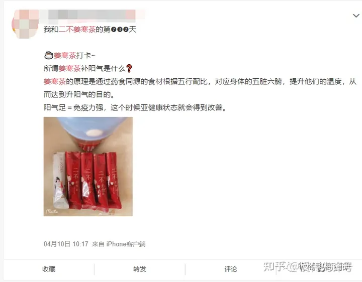 图片 此外,还有推广人员表示这款产品可以补阳气,阳气足等于免疫力强,显然,这位网友认为二不姜寒茶可以提高免疫力。