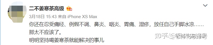 图片 该网友还认为:痛经、例假不调、鼻炎、咽炎、胃痛、湿疹等问题统统可以通过饮用二不姜寒茶来解决。