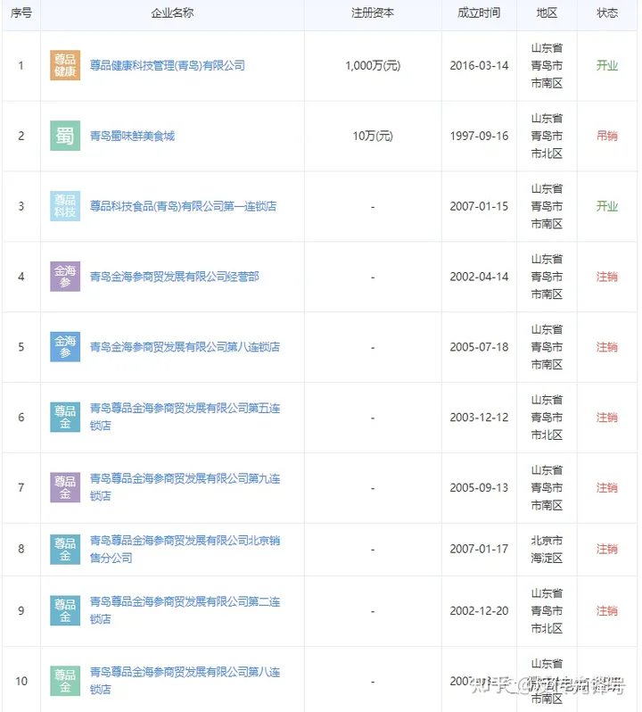 图片 官网难见,多为被告 尊品降科技管理(青岛)有限公司是二不姜寒茶的经营主体,该公司成立于2016年3月14日,法定代表人李爽,股东有李爽(大股东)和郭晓刚,注册资本1000万元,据爱企查显示,由李爽担任法定代表人的企业至少有10家,而其中的百分之八十似乎都已处于吊销或注销的经营状态。