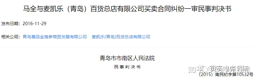 图片 2016年,马全与麦凯乐(青岛)百货总店有限公司买卖合同纠纷一审民事判决书引发关注,该判决书显示,原告马全诉称,原告于2015年在被告麦凯乐(青岛)百货总店有限公司超市尊品海参柜台购买了青岛尊品金海参商贸发展有限公司生产的玻璃瓶装尊品冻干刺参胶囊22瓶(每瓶售价288元),其中有两瓶没有标签、QS生产许可标志、食品生产许可证编号、生产日期、保质期的尊品牌冻干刺参胶囊。原告认为上述产品系非法加工生产假冒串用其他食品生产许可证编号,未获得任何行政许可部门审批,属于不合格食品或保健食品。原告请求:1、判令被告赔偿原告销售产品价款6336元的十倍赔偿金;2、请求人民法院判令被告收回售给原告食品,退回购买上述食品货款6336元。