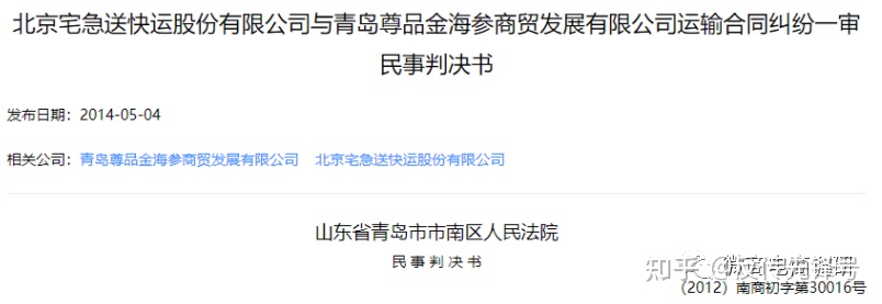 图片 2012年,北京宅急送快运股份有限公司与当时的青岛尊品金海参商贸发展有限公司发生纠纷,据北京宅急送快运股份有限公司与青岛尊品金海参商贸发展有限公司运输合同纠纷一审民事判决书显示,原告诉称,原、被告于2008年开始合作,被告从2010年10月至2011年1月四个月期间,拒不支付原告运费计14623.50元。经被告催要未果,现请求法院判令被告支付运费14623.50元及滞纳金20308.65元,而法院最终判令被告青岛尊品金海参商贸发展有限公司向原告北京宅急送快运股份有限公司支付运费9649.60元。