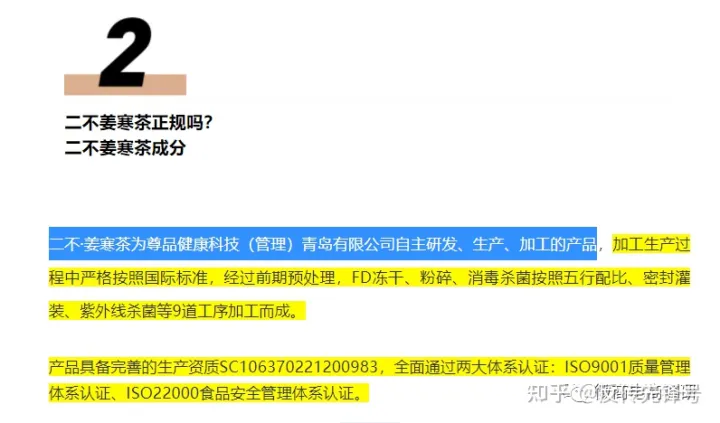 图片 有资料表示,这款产品也是尊品降科技公司自主研发、生产、加工的产品。而实际上,二不姜寒茶的实际生产企业的名字为尊品科技食品(青岛)有限公司,这一点从之后的相关处罚决定书中可以看到端倪,此处先不展开。