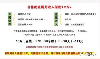 第三部分:小批发。成为小批发有两个条件:直接招代理15人,你的团队30人;带着以你为原点的团队,所有人的业绩加在一起1个月到10万,你就有小批发收入了。(只要有1个月达标,既永久享受小批发级别)。