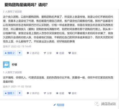 此外,在知乎有网友说道,这个良久团购,以前叫爱购团购,爱购团购名声臭了,所实际上就是传销,就是让你们不断的招代理,货基本上是卖给了代理,售后都是代理自己承担,客户退货也只能推给代理。那些产品都是可以在淘宝和京东还有阿里巴巴可以买到的,价格一样或者更便宜,但是在淘宝这些店里买东西售后无忧,所以要做良久(爱购)团购的宝妈清醒些吧,别把时间浪费在那个团购招代理上。到头来一分钱赚不到,家里还全是上面的人忽悠你买回家的垃圾。宝妈们不要被霜大老妈妈非衣骗了,做良久团购只会消耗你的人脉,你会被他们洗脑,不断的拉自己的同学亲戚来做这个,而你天天把时间花在上面,什么都做不了。不如拿出这认真劲,好好做别的事情。