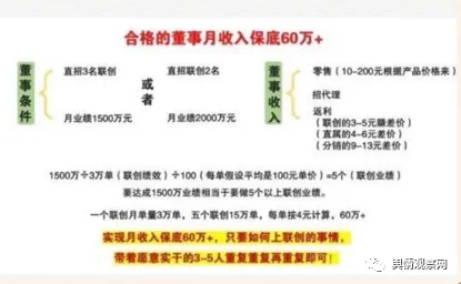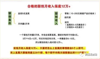 做到直属,代表着你帮助了很多人,管理着一个不小的团队了。所以你团队中的任何一单,你都可以有至少3元以上的感谢提成。这就是说,一个做到直属的人,她每个月的收入最少会有1-5万不等的收入,大的直属月收入会6-10万不等。代理商透露:第4部分的收入:联创收入。升级联创需要下面两个条件:第一个条件:拥有5条直属线;第二个条件:带着团队一个月内做到3万单。做到联创,代表你帮助了团队的一些代理做到直属,管理着几百人到几千人的团队。一个做到联创级别的人,她每个月的收入最少会在12万以上,大的联创月收入会超过30万40万50万不等,上不封顶。