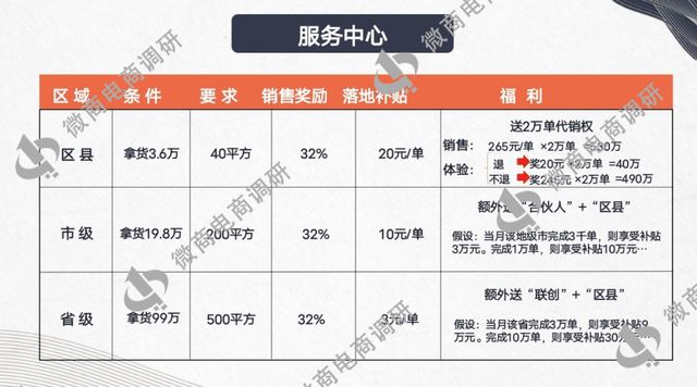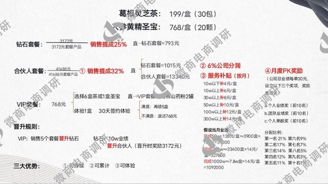 VIP:购买768元的VIP套餐可成为VIP,获得6盒葛根灵芝茶或一个人参黄精压片糖果(也可选择体验一盒,体验后满意领取剩余五盒,不满意退还768元)。VIP推荐一个VIP可获得2罐葛根山药粉奖励。 钻石:直接购买3172元的钻石套餐或是VIP直推5个VIP后可升级钻石。钻石销售产品可获得25%的销售提成,销售一万元的产品即可获得2500元提成。钻石推荐一个钻石可获得793元推荐奖励。 合伙人:直接购买41688元的合伙人套餐可成为合伙人,钻石累计十万业绩也可升级合伙人,晋升时还可获得3172元奖励。合伙人销售产品可获得35%的销售提成,合伙人推荐一个钻石可获得1015元推荐奖励,推荐一个合伙人可获得13340元推荐奖励。合伙人还可以享受公司分红、服务补贴和月度PK奖励。 公司分红:公司每个月拿出全公司总业绩的6%用于合伙人分红,所有合伙人均可参与分红。 服务补贴:团队月总业绩达到不同的目标可获得不同的补贴。业绩10万以下可获得4元/盒的补贴;业绩达到10万以上可获得6元/盒的补贴;业绩达到30万以上可获得8元/盒的补贴;业绩达到50万以上可获得10元/盒的补贴;业绩达到100万以上可获得12元/盒的补贴;业绩达到300万以上可获得14元/盒的补贴。 月度PK奖励:公司总业绩每单30元,设立个人业绩奖、团队业绩奖和个人单数奖三个奖项,每个奖项前十名可获得金瓜子奖励。分配比例为:第一名 21% 、第二名17%、第三名14%、第四名12%、第五名11% 、第六名9%、第七名7%、第八名5%、第九名3%、第十名1%。 如果有线下实体店,还可以申请服务中心,服务中心分为区县服务中心、市级服务中心和省级服务中心。