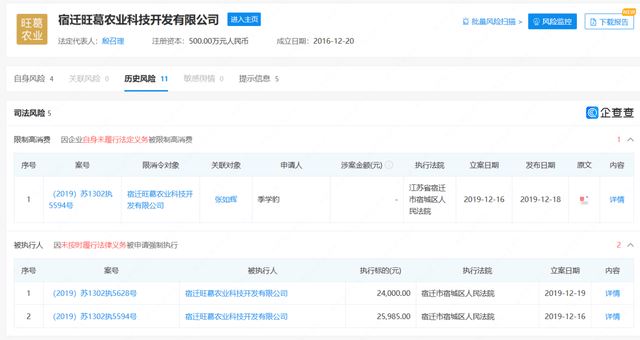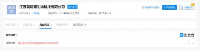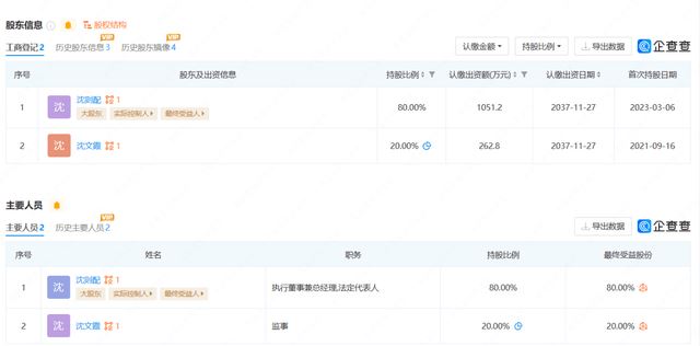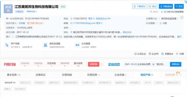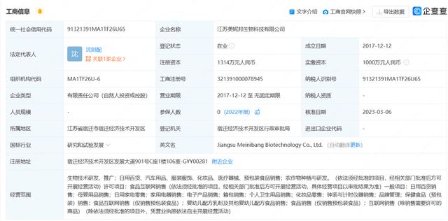 企查查APP显示,江苏美妮邦生物科技有限公司成立于2017年12月12日,企业地址位于宿迁经济技术开发区发展大道901号C座1楼106室-GYY00281,注册资本为1314万元,实缴资本为1000万元,法定代表人为沈则配。该公司由沈则配控股80%并担任执行董事兼总经理,沈文霞持股20%并担任监事。