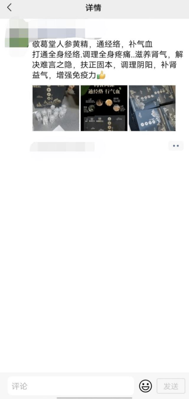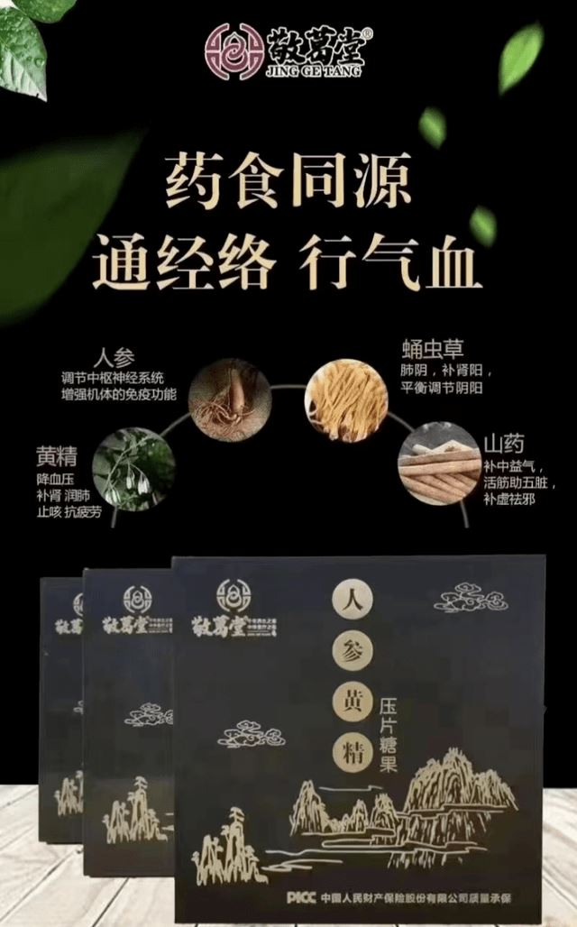 无独有偶,敬葛堂人参黄精压片糖果也被宣传可以打通全身经络,调理身体疼痛、调理阴阳、补肾益气、增强免疫力。推广人员还以产品成分暗示其产品具有降血压、降血脂、预防血栓、梗塞等疾病的功效,但这款人参黄精压片糖果也是属于食品。