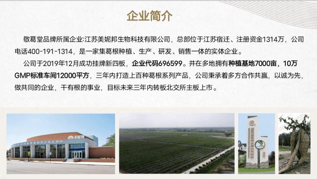 宣传资料显示,敬葛堂是江苏美妮邦生物科技有限公司旗下的品牌。江苏美妮邦生物科技有限公司总部位于宿迁,是一家集葛根种植、生产、研发、销售一体的企业,拥有7000亩种植基地,打造了上百种葛根系列产品。