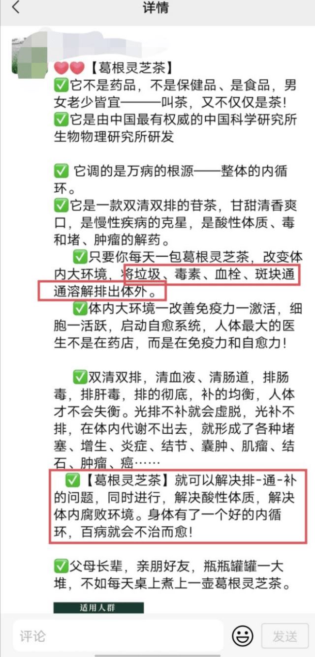 据敬葛堂代理宣传,葛根灵芝茶含葛根、灵芝、枳椇子、决明子、血参、桑叶、荷叶、山楂、茯苓等药食同源的成分,可以调理整体内循环,调理三高、助睡眠、清肠道、提高免疫力。每天一包葛根灵芝茶,即可将垃圾、毒素、血栓、斑块通通排出体外,解决酸性体质、解决体内腐败环境,百病不治而愈。 但实际上葛根灵芝茶的生产许可证号为SC10632130200733,属于食品,不是药品也不是保健品,不具备任何治疗效果和保健功能。食品安全国家标准预包装食品标签通则(GB7718-2011)规定,非保健食品不得明示或者暗示具有保健作用。当非保健食品广告宣传保健功能时,可依据广告法第九条第(十一)项的规定以及食品安全法实施条例规定禁止的情形对其定性。