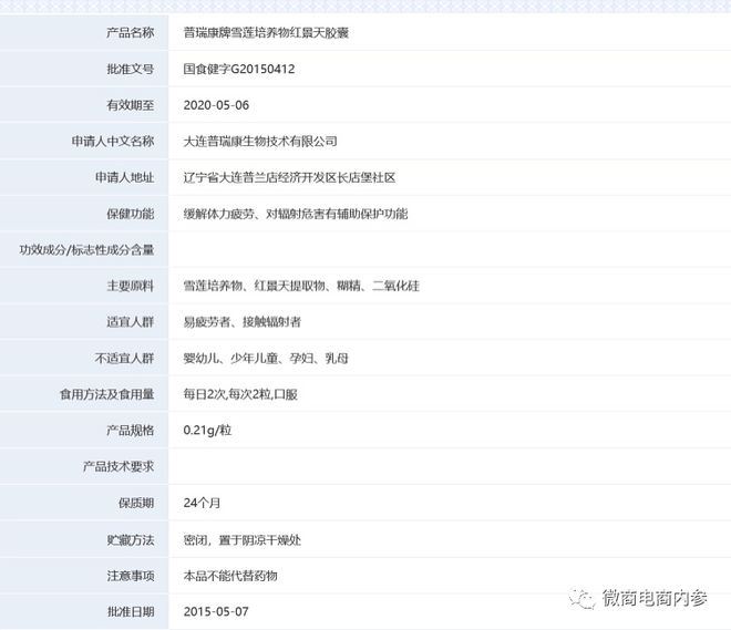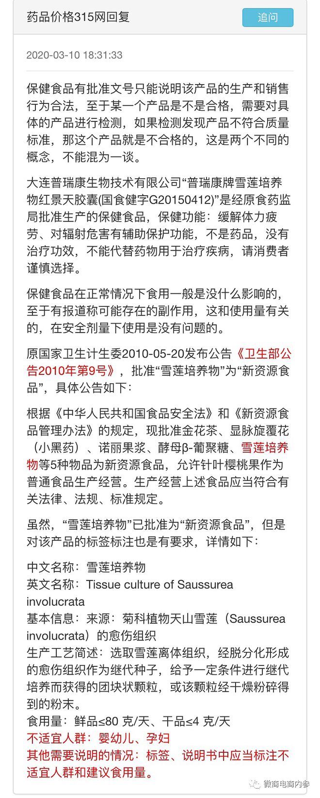 同时,在药品价格315网上,我们发现也有消费者对普瑞康牌雪莲培养物红景天胶囊的产品资质进行咨询,对此,得到的回复是:大连普瑞康生物技术有限公司的这款产品(国食健字G20150412)是经原食药监局批准生产的保健食品,其保健功能是缓解体力疲劳、对辐射危害有辅助保护功能,不是药品,没有治疗功效,不能代替药物用于治疗疾病,请消费者谨慎选择。