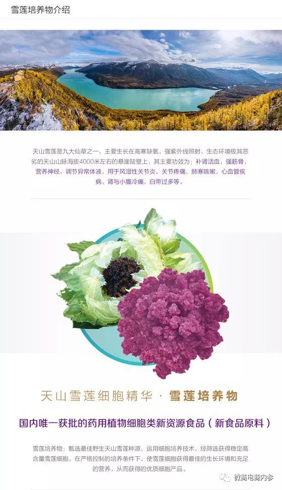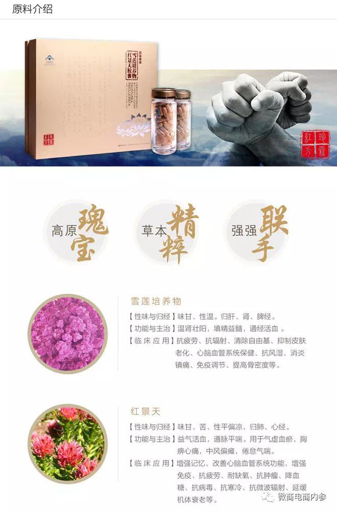 在对产品进行宣传时,普瑞康着重对雪莲培养物和红景天这两个成分进行了解读:雪莲培养物,主要功效为补肾活血、强筋骨、营养神经、调节异常体液,用于风湿性关节炎、关节疼痛、肺寒咳嗽、心血管疾病、肾与小腹冷痛等;而红景天功能主治为益气活血、通脉平喘,用于气虚血瘀、胸痹心痛、中风偏瘫等,其中还着重强调了雪莲培养物新资源食品的身份。