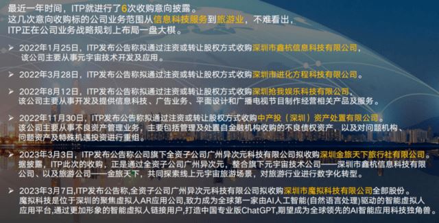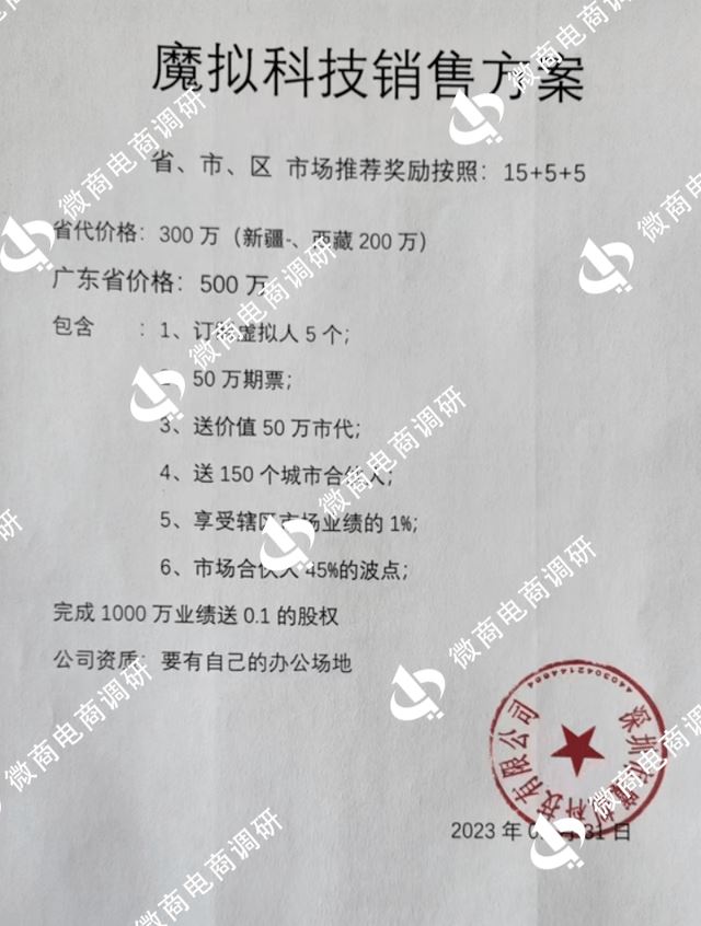 据知情人透露,在上述奖金制度中出现的股权指的是分公司的股权,未来公司会将数据打包上市,如此说来,届时这份股权的价值自然会变得相当值得期待。 魔拟科技,三重收益 2023年3月7日,ITP Holdings发布公告称,该公司与深圳市魔拟科技有限公司订立谅解备忘录,公司拟透过注资或转让股权方式收购魔拟科技的股权。4月18日,ITP Holdings再度发布公告称,与深圳魔拟科技一同成立一家合营企业,以此投资、运营元宇宙体验馆。 魔拟科技,是一家被闪够集团推广人员称之为是集团旗下位于第十板块的公司,与此同时,还有宣传课件称其为闪够的战略合作企业,现如今,还有不少闪够微仓储的合伙人也在网上对外推广魔拟科技旗下的项目,由此,足见两者间关联之紧密。