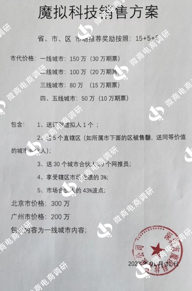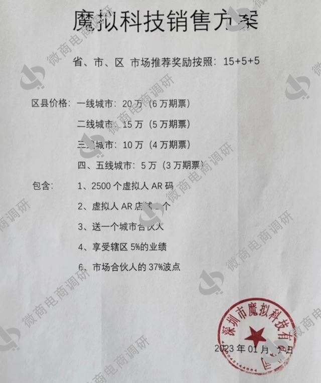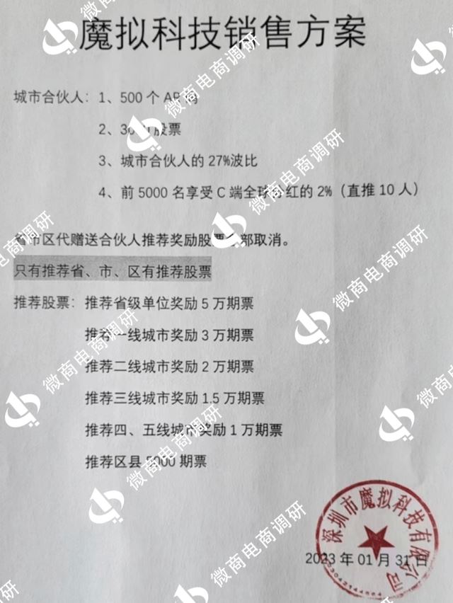 关于魔拟科技现行的奖金制度,据推广人员介绍,投资1万元成为城市合伙人后,即可获得以下三项权益: 其一,获得500个虚拟人AR码,每个利润500元,价值25万元。AR码全称魔拟科技智能AR码,关于其定义,有资料介绍,魔拟科技将现有的二维码进行智能化迭代,用户扫码会呈现三维智能化内容,如景点介绍、产品说明、亲子教育、AR名片、AR收款码等。 其二,赠送3000股。 其三,获得推广资格,网推员推广一个AR码,提成90元。 具体销售方案如下: