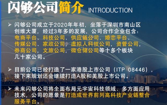 据推广人员介绍,闪够集团在中国香港已经上市,股票代码HK08446,集团旗下已有十多家公司,涵盖业务有科技技术、资产管理、供应链物流、网红直播、婚恋交友、智慧微仓储等。未来5年计划:1.一百家分公司;2.一万家实体体验店;3.一百万台自动售货柜。 据公开资料显示,股票代码为HK08446的公司并非闪够集团,其名为ITP Holdings,这是一家提供视像显示解决方案及其相关器材的香港本地企业,曾经为中国香港、中国台湾、韩国及中国内地知名艺人的大型流行音乐会、世界巡回演唱会及音乐颁奖典礼提供视像显示服务。近期,该公司通过收购布局虚拟人、元宇宙技术、旅游业等高增长赛道,将公司由单一业务转为多元化发展。 回首过往,闪够集团最初的经营主体并非广东省闪够智慧科技集团有限公司,而是深圳市进化方程科技有限公司,在眼下,仍有相关资料认定闪够集团如今的经营主体为深圳市进化方程科技有限公司。最开始,闪够的名字还不是闪够,而是抢够网。2021年12月5日,进化方程集团公司2021年度盛典暨表彰大会在广州举行,会上,公司正式宣布抢够网更名为闪够,从一个互联网价值电商平台转型为元宇宙嘲下的社交电商平台。 ITP Holdings曾于2022年3月28日发布公告称,公司的全资附属公司In Technical Productions Holdings Limited(买方)与深圳市进化方程科技有限公司订立无法律约束力谅解备忘录,买方拟透过注资或转让股权方式收购深圳进化方程的股权。