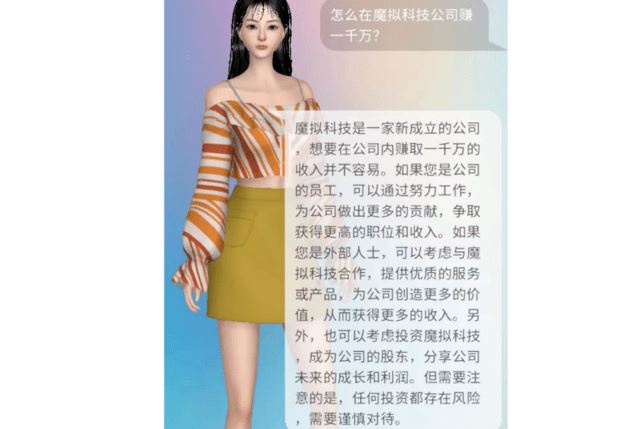 据公开资料介绍,魔拟科技是全球第一家专注于AI人工智能(自然语言处理工具)驱动的智能虚拟人应用科技公司。在管理层方面,董事长为栗子叶,总经理为武海洋,CEO为田雍达。