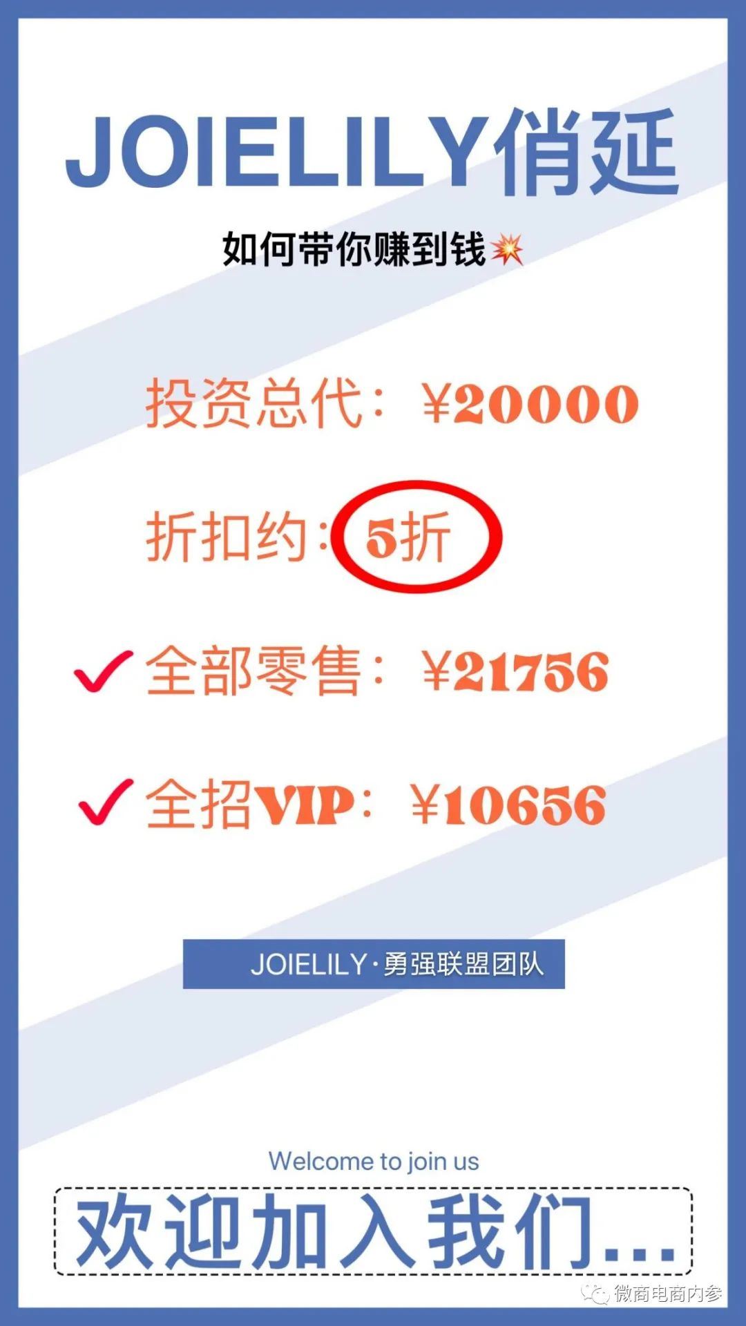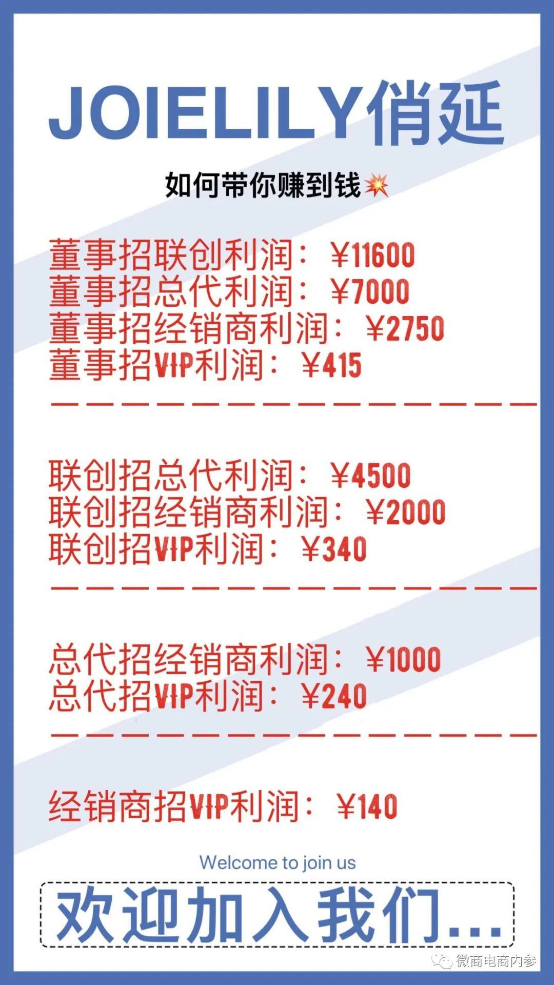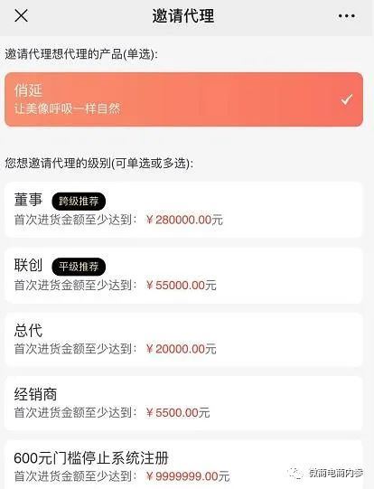 综上所述,俏延将代理商总共分为VIP、经销商、总代、联创、董事五个级别。VIP门槛为600元;经销商门槛为5500元;总代门槛2万元,拿货折扣为5折;联创门槛5.5万元,拿货折扣为3.9折。