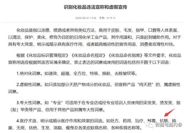 根据化妆品标识管理规定、化妆品命名规定、化妆品命名指南等文件要求,化妆品宣称用语应根据其语言环境来确定,禁止表达的词意或使用的词语包括但不限于以下词语:医疗术语、明示或暗示医疗作用和效果的词语。如处方、药用、治疗、解毒、抗敏、除菌、无斑、祛疤、生发、溶脂、瘦身及各类皮肤病名称、各种疾病名称等。显然,改善红肿、发炎等过敏现象并不是化妆品具有的功效,超出了化妆品定义,属于超范围宣传和宣传医疗作用。