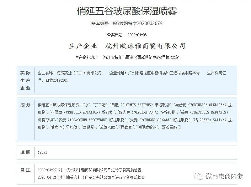 而实际上,俏延五谷玻尿酸保湿喷雾也仅为国产非特殊用途化妆品,备案编号为浙G妆网备字2020003675。虽然这篇文章的内容并没有直接通过该产品进行相关宣传,不过这种标题已然存在误导消费者的嫌疑。