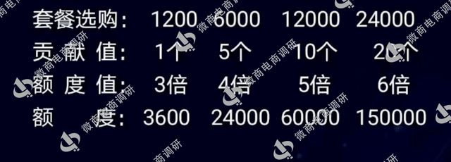 九大职级,五重收益 接下来,我们再来关注一下禹皇益购推行的奖金制度该如何解读。据推广人员阿强(化名)提供的资料显示,该平台共设置了四种消费套餐,门槛分别是1200元、6000元、12000元、24000元,对应的贡献值(分红权)分别是1个、5个、10个、20个,额度值分别是3600、24000、60000、150000。