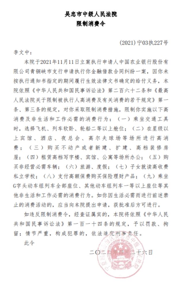 李文中本人也未能免俗,收到过限制消费令。