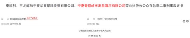 而在多年前,禹皇酒庄还曾牵涉到一宗有关非法吸收公众存款的案子当中,据李海利、王龙辉与宁夏华夏聚腾投资有限公司、宁夏青铜峡市禹皇酒庄有限公司等非法吸收公众存款罪二审刑事裁定书显示,宁夏回族自治区青铜峡市人民法院审理宁夏回族自治区青铜峡市人民检察院指控原审被告单位宁夏华夏聚腾投资有限公司、宁夏青铜峡市禹皇酒庄有限公司,原审被告人李海利、王龙辉、李文军(人称禹皇酒庄庄主、曾任禹皇酒庄董事长)犯非法吸收公众存款罪一案,于2018年12月27日作出(2018)宁0381刑初90号刑事判决。