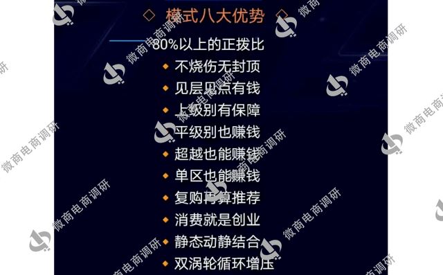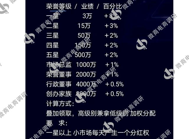 一、权益补贴(全国每日新增营业额20%) 公式为个人贡献值除以全国贡献值之后,再乘以每日新增营业额20%,权益补贴这项分红将一直分到额度值为止。 二、分享补贴:10% 小推大、不烧伤、可重复拿N次。 三、见点补贴:10% 20代的0.3%;20层的0.2%。代:有推荐关系的为代;层:无推荐关系的为层。 四、管理补贴:20% 1.一星 小区业绩考核达到3万升级一星,分红比例8% 2.二星 小区业绩考核达到15万升级二星,分红比例3% 3.三星 小区业绩考核达到50万升级三星,分红比例2% 4.四星 小区业绩考核达到150万升级四星,分红比例2% 5.五星 小区业绩考核达到500万升级五星,分红比例2% 6.市场总监 小区业绩考核达到1000万升级市场总监,分红比例1% 7.荣誉董事 小区业绩考核达到2000万升级荣誉董事,分红比例1% 8.行政董事 小区业绩考核达到4000万升级行政董事,分红比例0.5% 9.创办家族 小区业绩考核达到8000万升级创办家族,分红比例0.5%