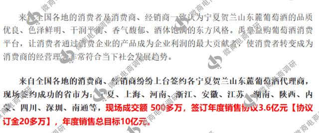 2023年4月8日,以醉美东麓链接世界,筑梦禹皇腾飞益购为主题的禹皇益购产融结合商业论坛盛世起航大会在宁夏举行。据悉,现场成交额达到500多万元,签订年度销售协议3.6亿元(协议订金20多万元),年度销售总目标为10亿元。