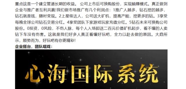 2021年,心海国际系统结缘湖南交泰科技,加入唐古拉优选拼团。同样没过多久,湖南日报便报道称:长沙市芙蓉区市场监督管理局表示,有关部门已对湖南交泰科技有限公司涉嫌网络传销立案调查。 之后,心海国际系统又与爱优品(重庆)电子商务有限公司达成合作,解宏任职爱优品市场部总裁。当时间来到2023年,心海国际系统便开始为禹皇益购执鞭坠蹬。